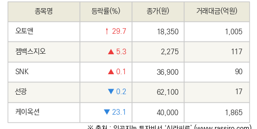 특히 오토앤은 전 거래일 대비 29.7% 오른 18,350원에 거래를 마감하여 높은 관심을 받았다. 이외에 케이옥션은 58,000원까지 올라 신고가를 경신했으나, 전일보다 오히려 하락한 40,000원에 거래를 마감했다.