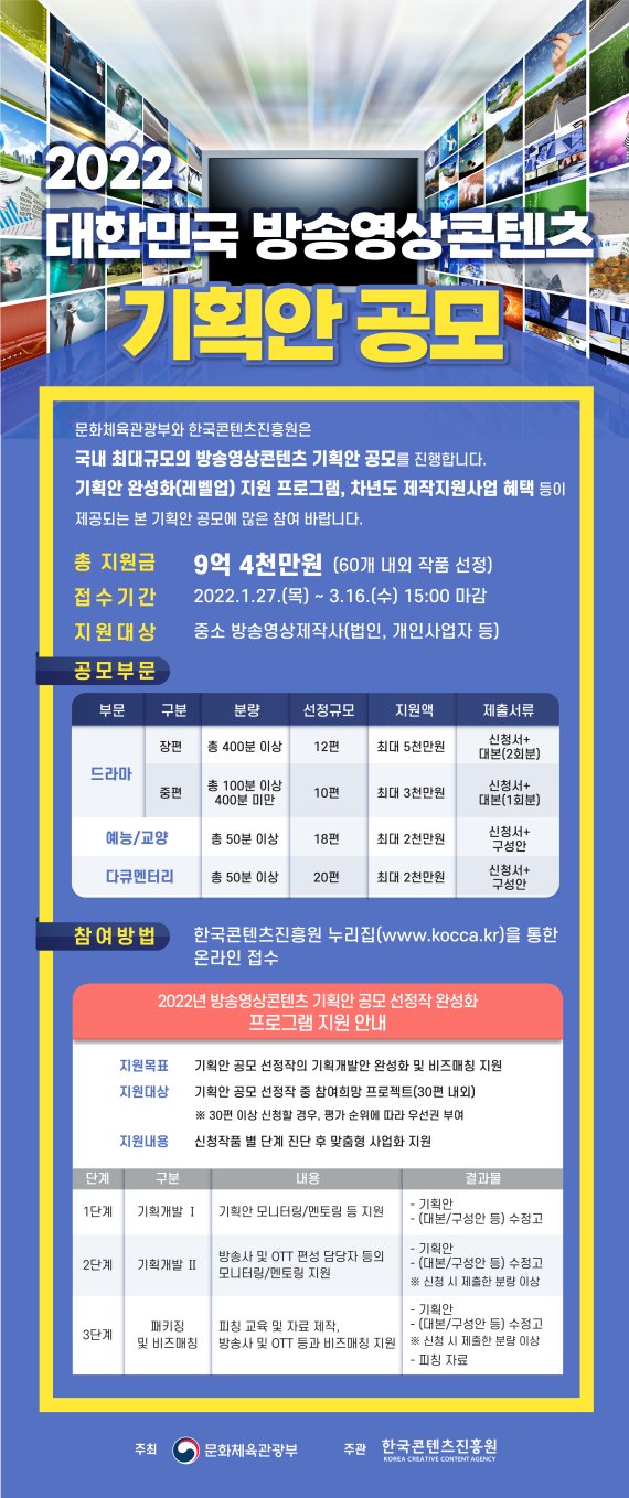문체부는 한국콘텐츠진흥원과 함께 27일부터 ‘2022 대한민국 방송영상콘텐츠 기획개발’ 공모전을 열어 일반, 온라인동영상서비스(OTT) 플랫폼 연계, 국제영화제 연계, 사회적 가치 주제 짧은 영상 등 유형별로 드라마, 예능·교양, 다큐멘터리 등 분야의 우수한 기획안을 찾는다.