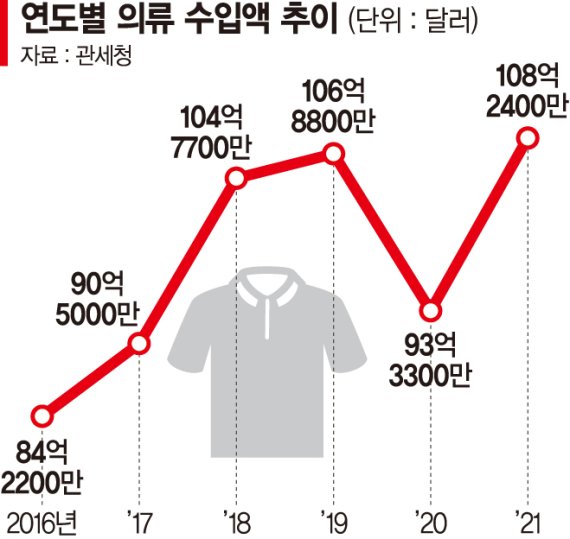 6일 관세청 수출입무역통계에 따르면 2021년 의류 수입액은 전년(93억3300만달러) 대비 16% 증가한 108억2400만달러로 집계됐다. 종전의 역대 최대치인 2019년(106억8800만달러)를 넘어섰다. 의류 수입액은 꾸준히 증가해오다 코로나19로 타격을 입은 2020년에는 12.7% 감소한 바 있다.
