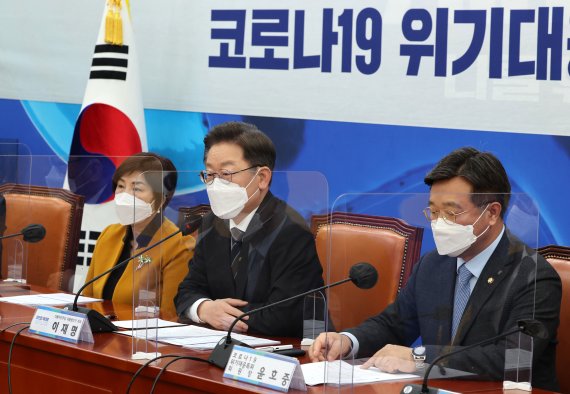 이재명 더불어민주당 대선 후보가 8일 서울 여의도 국회에서 열린 코로나19 위기대응특위 오미크론 대응 긴급점검회의에서 발언하고 있다. 공동취재사진, 뉴시스.