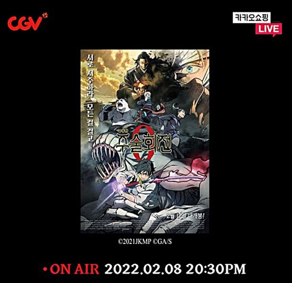 [파이낸셜뉴스] CGV가 카카오 쇼핑라이브 최초로 영화 라이브를 진행한다. CGV는 8일 저녁 8시30분부터 1시간 동안 카카오 쇼핑라이브를 통해 '극장판 주술회전0' 특집 라이브를 진행한다고 밝혔다.