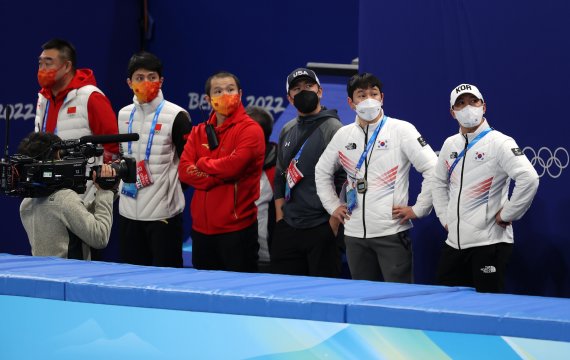 [베이징(중국)=뉴시스] 홍효식 기자 = 7일 오후 중국 베이징 캐피털 실내경기장에서 열린 2022 베이징 동계올림픽 쇼트트랙 남자 1000m 준결승 경기, 한국 이영석(오른쪽), 김병준 코치가 전광판을 확인하고 있다. 왼쪽 두번째는 중국 안현수(러시아명 빅토르 안)기술코치. 2022.02.07. yesphoto@newsis.com [서울=뉴시스]신재우 기자 = 지난 7일 베이징 동계올림픽 쇼트트랙 남자 1000m 준결승에서 황대헌(강원도청)과 이준서(한체대) 선수가 석연찮은 판정으로 실격 당하자 번쩍 들어올린 안중현 코치의 손에 쥐어진 '100달러' 지폐가 화제다.