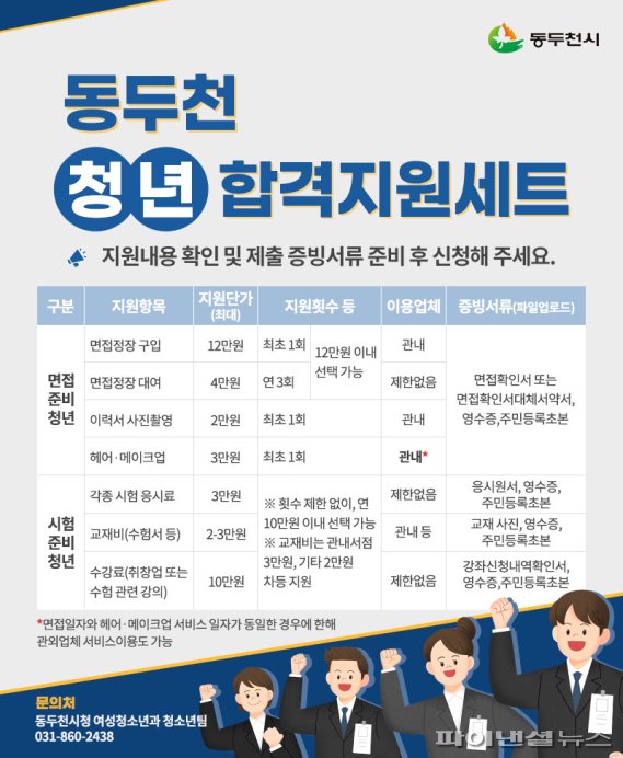 【파이낸셜뉴스 동두천=강근주 기자】 동두천시가 청년 취업준비 부담을 경감하고, 구직활동을 촉진하기 위해 ‘청년구직비용 패키지 지원(일명 동두천청년합격지원세트)’사업을 작년에 이어 올해도 시행한다.