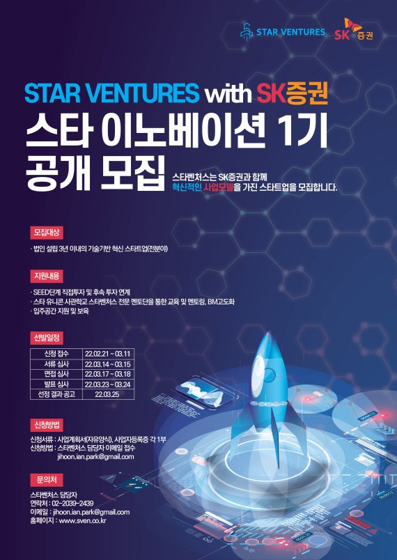 [파이낸셜뉴스] 스타벤처스는 SK증권과 함께 차세대 기술기반 유니콘 창업기업을 발굴, 육성하기 위한 유니콘 액셀러레이터 프로그램 '스타 이노베이션'에 참가할 1기 스타트업을 공개 모집한다고 22일 밝혔다.