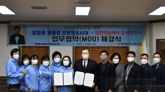 [파이낸셜뉴스] 임영웅 팬클럽 강원영웅시대와 대한적십자사 강원도지사는 지난 22일 강원적십자사 상임위원실에서 ‘지역사회 인도주의 사업 활성화를 위한 사회공헌협약(MOU)’을 체결했다.