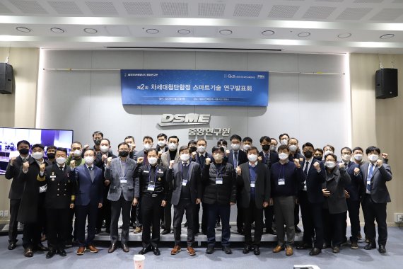 지난 22일 대우조선해양 시흥 R&D캠퍼스에서 각 분야별 관계자들이 ‘차세대 첨단함정 스마트 기술 연구발표회’를 가진 뒤 기념 촬영을 하고 있다. 대우조선해양 제공