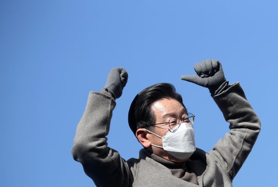 이재명 더불어민주당 대선 후보가 24일 오전 충북 충주시 젊음의거리에서 열린 ‘대한민국 국토 심장부 충북 발전, 이재명은 합니다!’ 충주 집중유세에서 연설을 마친 후 인사하고 있다. 2022.2.24/뉴스1