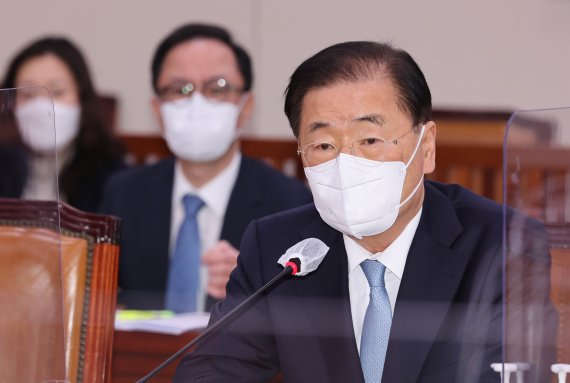 [서울=뉴시스] 전신 기자 = 정의용 외교부 장관이 25일 서울 여의도 국회에서 열린 외교통일위원회 전체회의에서 우크라이나 사태 관련 의원 질의에 답변하고 있다. (공동취재사진) 2022.02.25. photo@newsis.com /사진=뉴시스