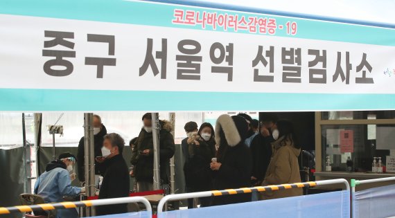 8일 오전 서울 봉래동 서울역광장에 마련된 선별진료소를 찾은 시민들이 코로나19 검사를 받기 위해 줄을 서 있다. 뉴스1 제공