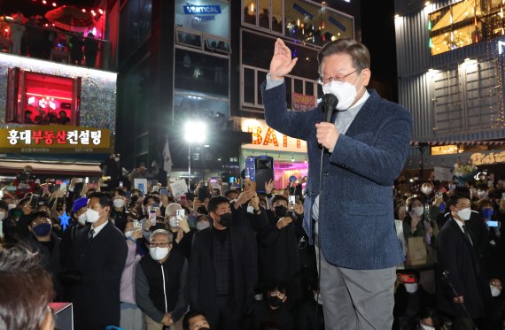 이재명 더불어민주당 대선 후보가 8일 서울 마포구 홍대 걷고싶은거리에서 지지를 호소하고 있다. 사진=뉴시스화상