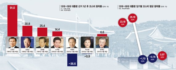변준호 흥국증권 연구원은 "직선제가 시작된 노태우 전 대통령 사례부터 보면 증시는 대선 이후 강세를 보였지만 최근으로 올수록 취임 첫해 성과가 부진하다"고 지적했다.