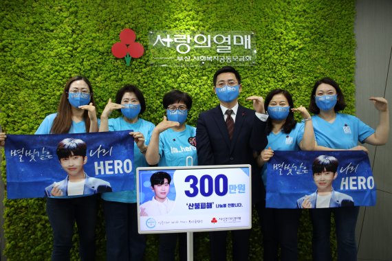 부산사랑의열매 박은덕 사무처장(왼쪽 네번째)와 영웅시대 with hero 부산금정산 팬클럽회원들이 성금 전달 후 기념사진을 찍고 있다./제공=부산사랑의열매
