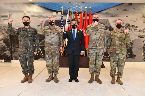 서욱 국방부 장관(가운데)이 16일 오후 경기도 평택 소재 주한미군기지 '캠프 험프리스'에 주둔 중인 한미연합사단을 방문, 폴 러캐머라 한미연합사령관(완쪽에서 두번째), 김승겸 연합사 부사령관(왼쪽 첫번째) 등 주요 직위자와 기념촬영을 하고 있다. 사진=국방부 제공