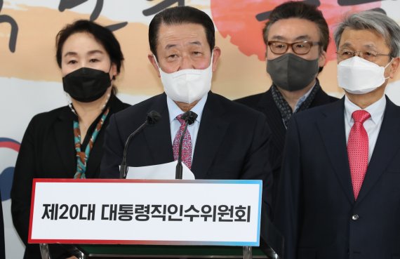 박주선 대통령취임식 준비위원회 위원장이 23일 서울 종로구 삼청동 대통령직인수위원회 브리핑실에서 기자회견을 하고 있다. /사진=뉴시스