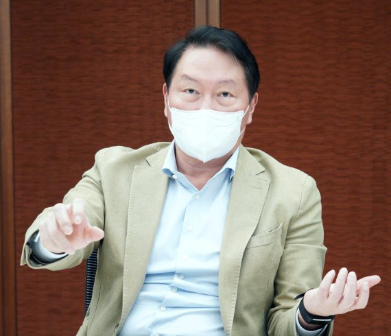 최태원 대한상공회의소 회장이 지난 23일 서울 중구 세종대로 대한상의 회관에서 열린 기자간담회에서 새정부에 대한 기대감 등을 얘기하고 있다.