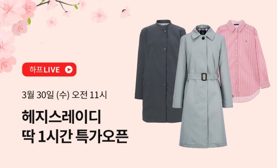하프클럽은 오는 30일 11시에 첫 라방에 나선다. 봄을 맞아 헤지스 레이디의 트렌치코트, 점퍼, 셔츠, 팬츠 등 7개 품목을 최대 68% 할인가에 판매한다.