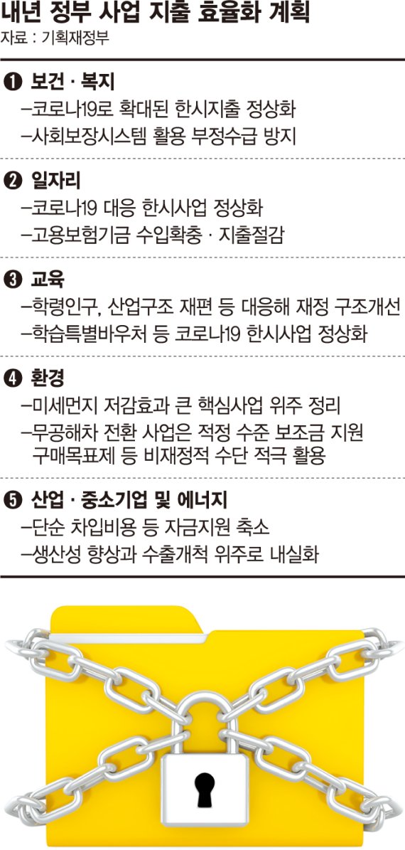 정부가 내년 예산 재원을 마련하기 위해 강도 높은 지출 구조조정에 나선다. 기존 문재인 정부 사업을 전면 재검토해 불필요한 사업은 쳐내는 식으로 새 정부에 필요한 예산을 마련할 계획이다. 이를 위해 코로나19 대응으로 대폭 늘어난 한시지출을 감축하고 집행부진 사업 규모는 최대 절반까지 줄인다는 방침을 세웠다.