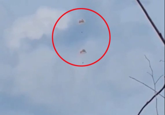 1일 오후 1시36분쯤 경남 사천시 정동면 고읍리 한 야산에 공군 훈련용 전투기(KT1) 1대가 추락한 가운데 조종사들이 비상탈출하고 있다.(독자제공) 사진=뉴스1