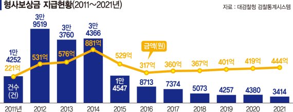 과적 차량에 대한 양벌규정을 담은 옛 도로법 86조 위헌 결정에 따라 일시적으로 형사보상금 지급액이 폭증한 2012~2015년을 제외해도 형사보상금 지급액은 꾸준히 늘고 있다. 2017년 360억원(7374건)이었던 형사보상금 지급액은 2018년 367억(5073건), 2019년 419억원(4380건), 지난해 444억원(3414건)으로 23.3% 증가했다.