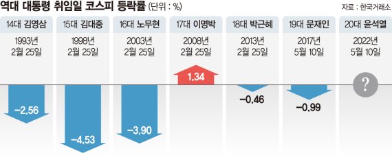 대통령 취임일에 증시가 상승한 건 전 거래일 대비 1.34% 상승한 17대 이명박 전 대통령(2008년 2월 25일) 때 뿐이다.