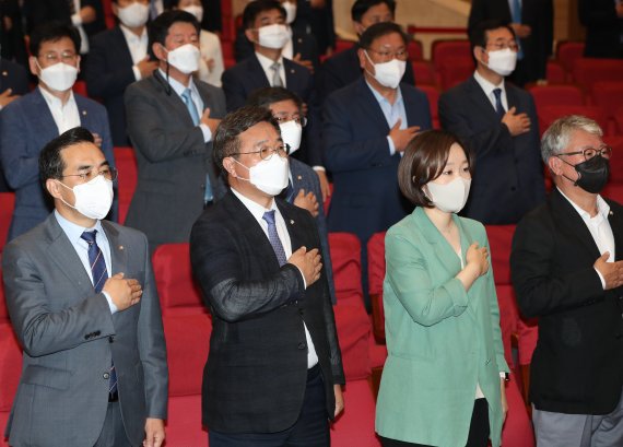 윤호중 더불어민주당 비상대책위원장과 의원들이 20일 서울 여의도 국회 의원회관에서 열린 의원총회에서 국민의례를 하고 있다. 사진=뉴스1