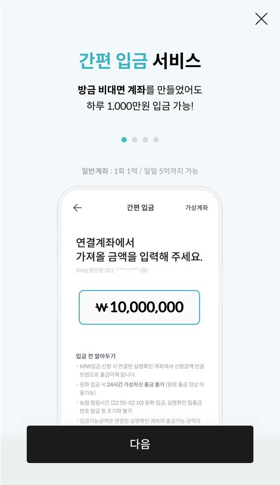 비대면으로 개설한 계좌의 경우 1일 입금한도가 100만원인데, 간편입금 서비스를 사용하면 1일 최대 1000만원까지 입금이 가능해진다. 비대면 개설 계좌가 아닌 일반계좌를 등록한 고객의 경우, 간편입금 서비스를 이용 시 1회 1억원, 1일 5억원까지 입금할 수 있다.