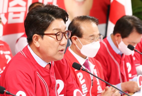 26일 인천 계양구 윤형선 국민의힘 6.1 재보궐선거 계양을 국회의원 후보 선거 사무실에서 열린 현장 원내대책회의에서 권성동 원내대표가 모두 발언을 하고 있다. 2022.5.26/뉴스1 © News1 국회사진취재단 /사진=뉴스1
