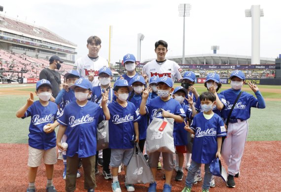 지난 29일 수원 KT위즈파크에서 ‘베스트원야구단’ 학생들이 kt wiz 고영표, 소형준 선수와 기념사진을 촬영하는 모습. K쇼핑 제공.