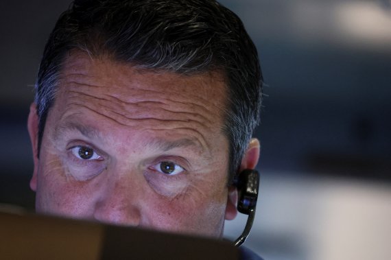 미국 뉴욕 맨해튼 뉴욕증권거래소(NYSE)에서 3일(현지시간) 한 중개인이 심각한 표정으로 모니터를 들여다보고 있다. 이날 뉴욕증시 3대 지수는 상승 하루 만에 다시 급락세로 돌아섰다. 로이터뉴스1