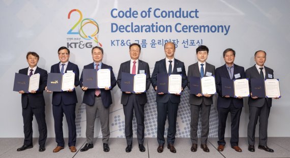지난 8일 코트야드 메리어트 남대문 호텔에서 열린 'KT&G 그룹 윤리헌장 선포식'에서 백복인 KT&G 사장(왼쪽 넷째)과 국내 7개 자회사 대표가 기념촬영을 하고 있다.(KT&G 제공)