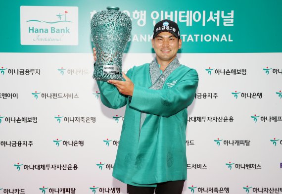 19일 강원도 춘천시 남춘천CC에서 막을 내린 KPGA코리안투어 하나은행 인비테이셔널에서 시즌 첫승이자 통산 2승째를 거둔 이준석이 우승 트로피를 들고 포즈를 취하고 있다. /사진=KPGA
