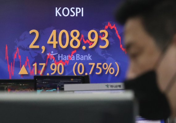 21일 서울 중구 하나은행 명동점 딜링룸 전광판에 코스피가 전 거래일 대비 17.90 포인트(0.75%) 상승한 2408.93을 나타내고 있다. 뉴스1 제공