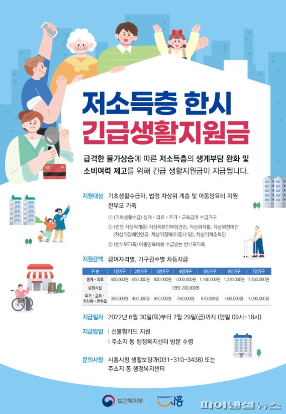 【파이낸셜뉴스 시흥=강근주 기자】 시흥시가 오는 30일부터 코로나19 기간 중 급격한 물가상승으로 어려움을 겪는 저소득층의 생계부담을 덜어주고자 한시 긴급생활지원금을 지급한다. 이번 지원금은 정부가 2차 추가경정예산 편성에 따라 한시적으로 지원하며 전액 국비로 지급된다.