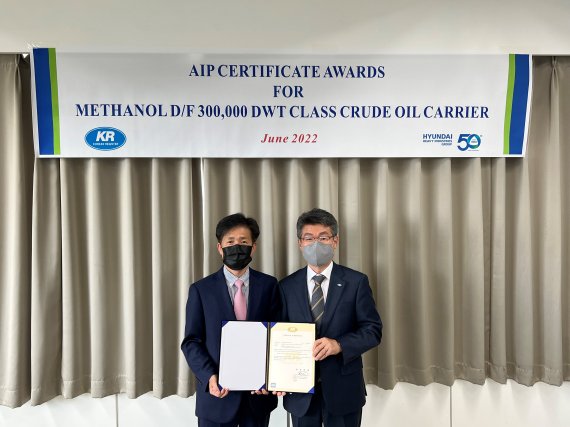 [파이낸셜뉴스] 한국선급(KR)은 최근 서울 종로구에 위치한 현대중공업 사옥에서 KR과 현대중공업그룹 관계자가 참석한 가운데 '메탄올 이중연료추진 300K 유조선'에 개념승인(AIP)을 수여했다고 22일 밝혔다.