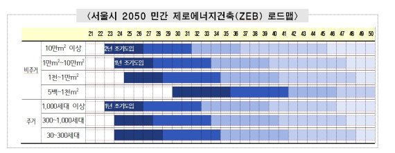 우선 내년부터 신축 민간 건축물에 '제로에너지건축물' 도입 의무화에 나선다. 주거 1000가구 이상, 비주거 연면적 10만㎡ 대규모 건축물을 시작으로 2050년까지 단계적으로 등급을 높여가며 신축 건축물 온실가스 배출을 줄여나갈 계획이다.