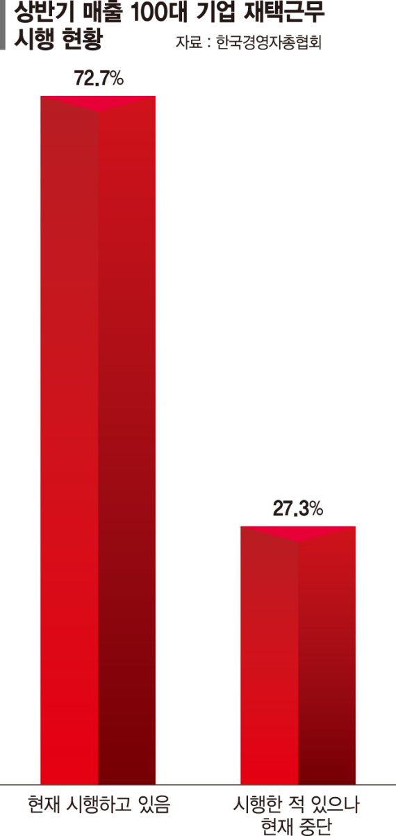 10일 한국경영자총협회 등에 따르면 상반기 매출 100대 기업을 대상으로 조사한 결과 10곳 중 7곳은 재택근무를 시행 중인 것으로 나타났다.