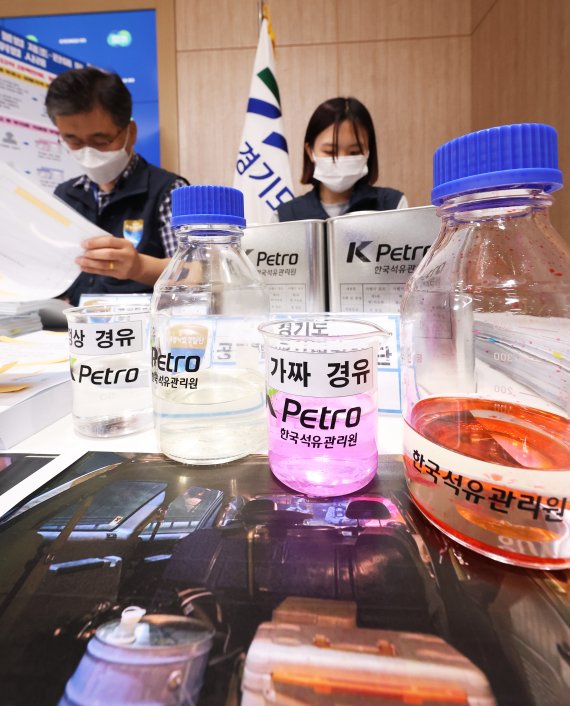 경유에 값싼 난방용 등유를 섞어 가짜 석유를 만들어 팔거나 가격표시를 하지 않고 비싼 가격으로 석유를 판매한 주유업자들이 경기도에 적발됐다. 경기도 공정특별사법경찰단은 지난 5~6월 한국석유관리원과 공조해 석유제품 불법 유통을 수사해 6명을 적발했다고 11일 밝혔다. 11일 오전 경기 수원 경기도청 브리핑룸에서 관계자들이 압수한 시료 등을 보여주는 모습. 연합뉴스