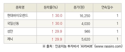 [fnRASSI]오늘의 상한가, 현대바이오랜드 30.0% ↑