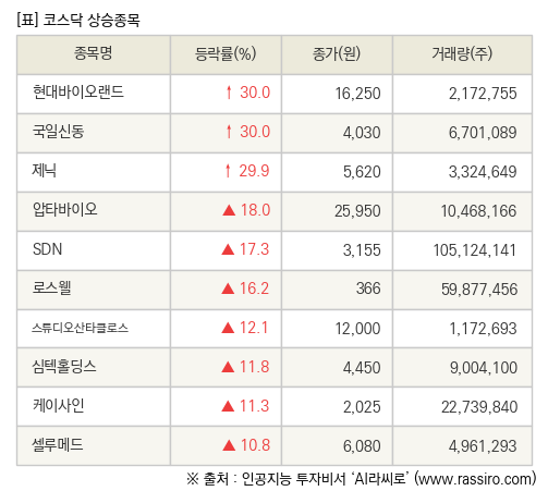 [fnRASSI]장마감, 코스닥 상승 종목(현대바이오랜드 30.0% ↑)