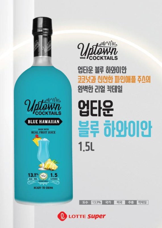 이에 롯데슈퍼는 바캉스 철을 맞아 업타운 홈칵테일 시리즈의 여름 상품인 ‘업타운 블루 하와이안 1.5L’을 국내 유통사 단독 출시했다. 코코넛과 파인애플 주스를 베이스로 해 프리믹스된 제품으로 얼음 또는 토닉워터만 넣어도 칵테일로 즐길 수 있는 간편함이 인기 요인이다.