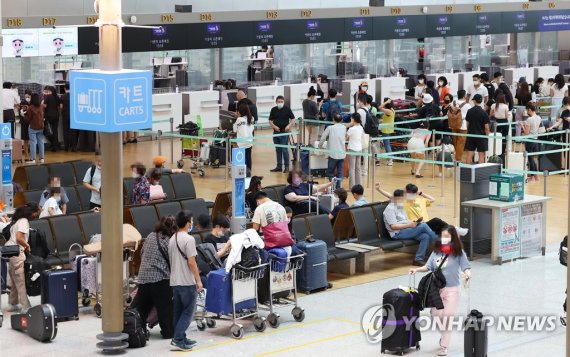 지난 10일 오후 인천국제공항 제1여객터미널 출국장이 여행객들로 북적이고 있다. 연합뉴스