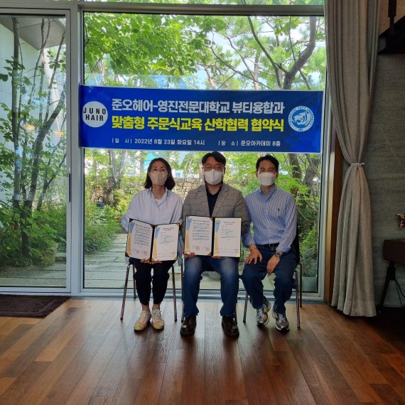 영진전문대와 ㈜준오뷰티가 23일 서울 준오헤어 회의실에서 주문식 교육 협약을 체결했다, 사진은 김수연 ㈜준오뷰티 이사와 방상규 본부장, 배기완 뷰티융합과 학과장(왼쪽부터)이 기념 촬영을 하고 있다. 사진=영진전문대 제공
