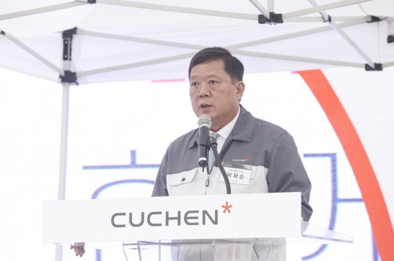 23일 박재순 쿠첸 대표가 천안공장 신축 준공식에서 기념사를 통해 쿠첸의 미래 비전을 소개하고 있다. 쿠첸 제공