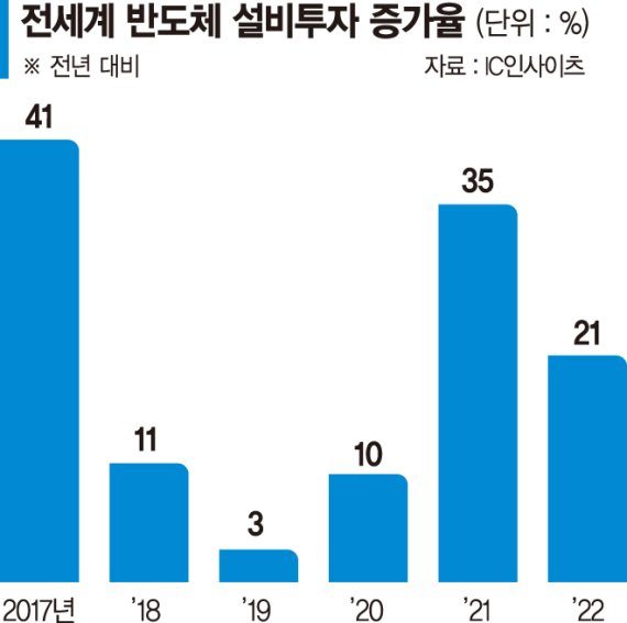 24일 시장조사기관 IC인사이츠는 올해 전세계 반도체 시장 설비투자 규모를 1855억달러(약 248조 7500억원)로 전망했다. 지난 3월 예상치(1904억달러)보다 눈높이를 더 낮췄다. 올해 기준 전년 동기 대비 설비투자 증가율도 21% 수준으로, 2021년(35%) 대비 축소될 것으로 전망했다.