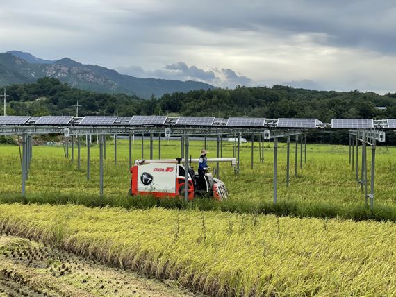 지난 1일 방문한 경남 함양군 기동마을 내 영농형 태양광 발전소 모듈은 콤바인 한 대가 충분히 지나다닐 만큼 높았다. 이태식 기동마을 사회적협동조합장은 “모듈 높이는 3~5m로 콤바인, 이앙기 등 농기계가 다니기 수월하다”면서 “농경 활동에 영향을 적게 받는다”고 말했다.
