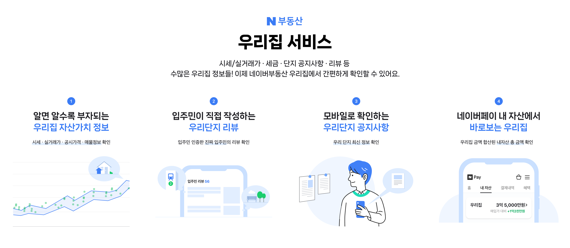 우리집 서비스에 부동산을 등록할 때도 등기부등본 및 네이버페이 배송지 주소 대조를 통한 인증절차를 거친다. 이를 통해 입주민이 직접 참여하는 우리 단지 공지사항과 입주민 리뷰 등 생생한 콘텐츠 및 커뮤니티 기능을 이용할 수 있다.