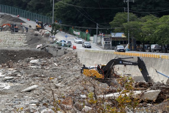 지난 15일 경북 포항시 남구 오천읍 오어지 하류에서 작업자들이 중장비를 동원해 태풍 힌남노로 심하게 부서진 하천 주변을 복구하고 있다. /사진=연합뉴스