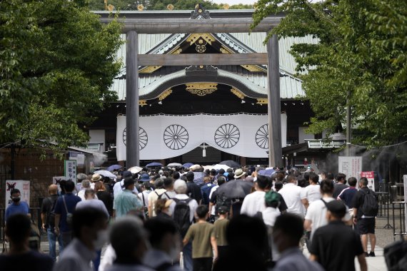일본의 패전일인 지난 15일 도쿄 소재 야스쿠니신사에서 시민들이 참배를 위해 줄을 서 있다.