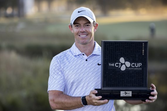 로리 매킬로이(33·북아일랜드)가 24일(한국시간) 미국 사우스캐롤라이나주 리질랜드의 콩가리 골프클럽에서 열린 미국프로골프(PGA)투어 더CJ컵(총상금 1050만달러) 대회에서 우승한 후 트로피를 들고 있다. AP연합뉴스