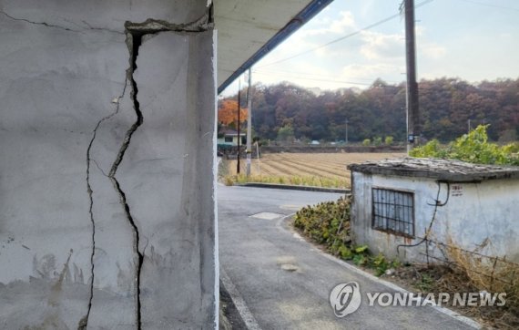 규모 4.1의 지진이 발생한 29일 충북 괴산군 장연면 장암리 한 주택 담벼락이 갈라졌다는 주민 신고가 접수됐다. 사진은 금이 간 담벼락의 모습. /사진=연합뉴스